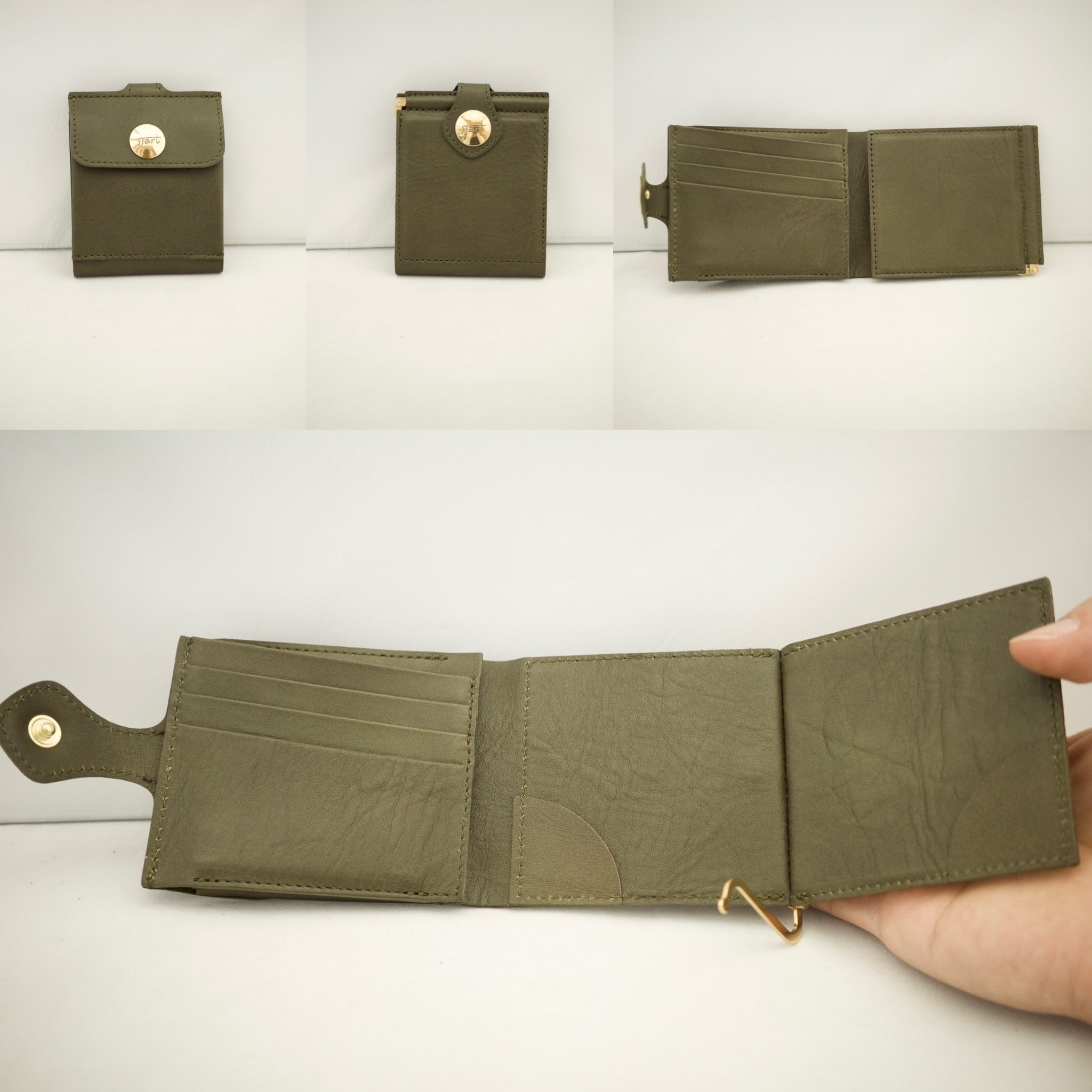 マネークリップ金具でお札をスマートに挟み、カードと小銭もひとつに収納できるオールインワン設計。